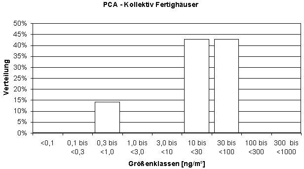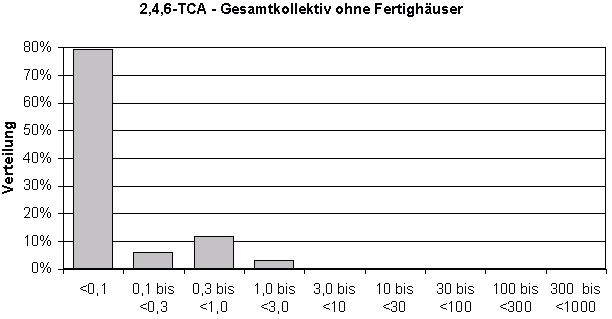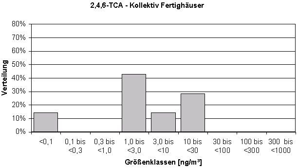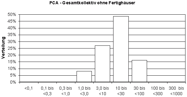 Bei TCA werden die Differenzen am deutlichsten: Im "Gesamtkollektiv ohne Fertighäuser" liegen weniger als 5% der Messwerte über 1 ng/m³, die maximal gemessene Konzentration betrug 1,7 ng/m³ (Tabelle 3) - TCA ist dort also kaum nachzuweisen (Diagramm 2). Im Kollektiv "Fertighäuser" wurden dagegen fast nur Konzentrationen ab 1 ng/m³ gemessen (Diagramm 3), der Median liegt bei 3,4 ng/m³, das Maximum bei 25 ng/m³ (Tabelle 4). Damit liegt der Median um etwa 1,5 Größenordnungen (also Faktor 15) höher. Die beiden Messwert-Verteilungen überschneiden sich so gut wie nicht.