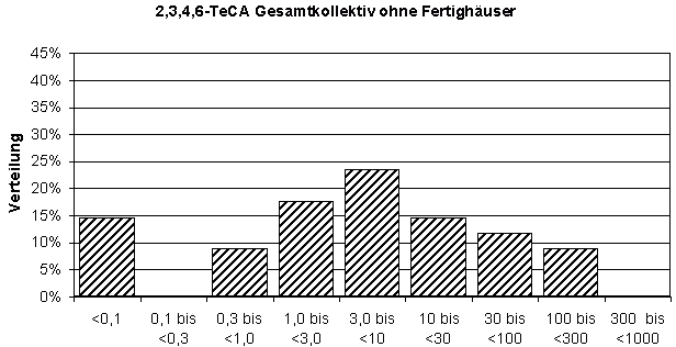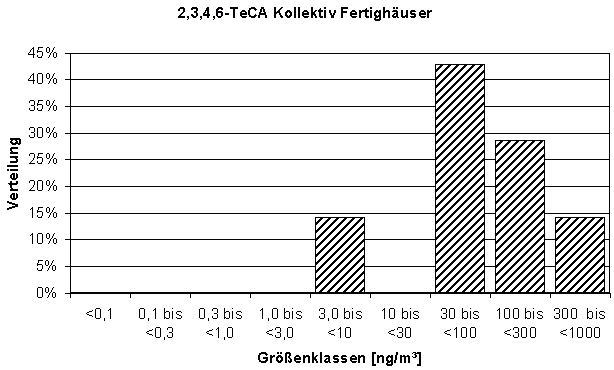 Bei TeCA verhält es sich ähnlich, die Unterschiede sind jedoch weniger deutlich ausgeprägt: Im "Gesamtkollektiv ohne Fertighäuser" liegt der Schwerpunkt der Messwert-Verteilung (Median 4,1 ng/m³) ebenfalls wesentlich niedriger als beim Kollektiv "Fertighäuser" (Median 70 ng/m³) (Diagramme 4 und 5, Tabellen 3 und 4), und ebenso verhält es sich mit den gemessenen Maximalkonzentrationen (190 bzw. 740 ng/m³). Beide Verteilungen überschneiden sich jedoch in weiten Bereichen.